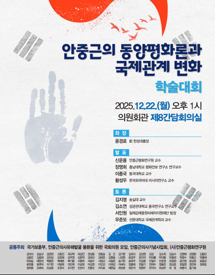 안중근의 동양평화론과 국제관계 변화 학술대회 페이지 정보 작성자 최고관리자 작성일25-12-22 09:11 조회14회 관련링크 다음글 목록 본문 ■ 안중근의 동양평화론과 국제관계 변화 학술대회- 일 시 : 2025.12.22(월) 오후 1시- 장 소 : 국회의원회관 제8간담회의실- 공동주최 : 국가보훈부, 안중근의사유해발굴 봉환을 위한 국회의원 모임, 안중근의사기념사업회, (사)안중근평화연구원 다음글 목록