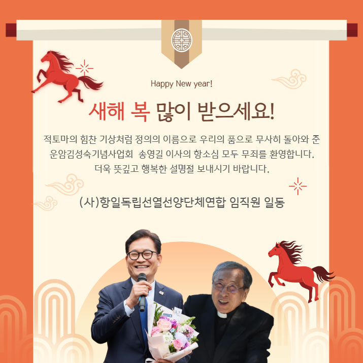 행복한 설명절 보내세요 페이지 정보 작성자 최고관리자 작성일26-02-14 14:17 조회83회 관련링크 이전글 다음글 목록 본문 행복한 설명절 보내세요!적토마의 힘찬 기상처럼 정의의 이름으로 우리의 품으로 무사히 돌아와 준운암김성숙기념사업회 송영길 이사의 항소심 모두 무죄를 환영합니다.더욱 뜻깊고 행복한 설명절 보내시기 바랍니다.(사)항일독립선열선양단체연합 임직원 일동 이전글 다음글 목록