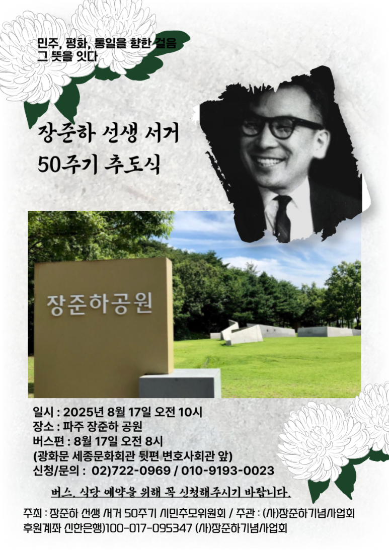 독립운동가, 민주화운동, 사상계 발행인으로 알려진 장준하 선생 서거 50주년 추모제가 개최됩니다.